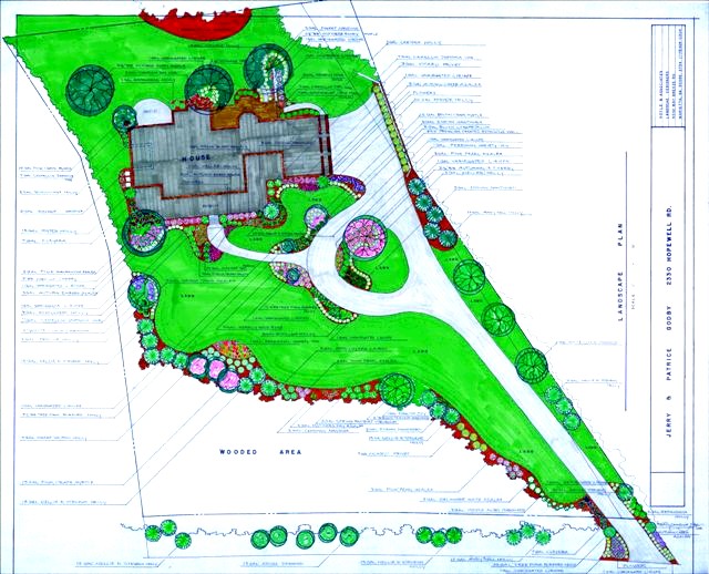 This design was for a big lot. That needed privacy along the right and back property lines. The front had a steep drop from the sidewalk to the lower lawn. The biggest challenge was to tie the house to a outdoor fireplace and large terrace in the left back corner of the yard. The plant selection will provide color at different times of the year.